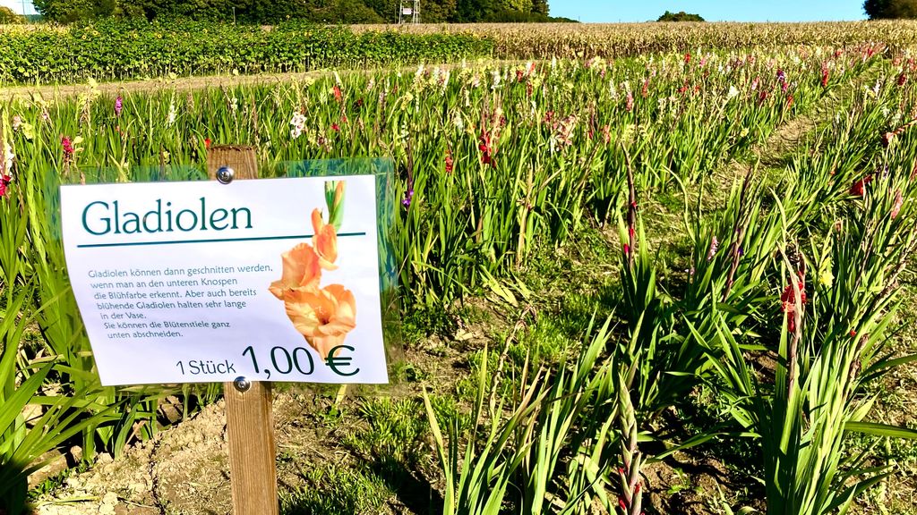 An der Einfahrt zum Blumenfeld steht ein großes Schild, darunter eine Kasse, in die man das Geld werfen kann. "Nur bezahlte Blumen bringen Freu(n)de!", steht groß auf dem Schild. Auf einer der Parzellen hat Hans Faulstich 30.000 Gladiolenzwiebeln gesetzt, jetzt blühen die Blumen in allen Farben. Würden alle abgeschnitten, müssten am Ende der Saison theoretisch 30.000 Euro in der Kasse sein.