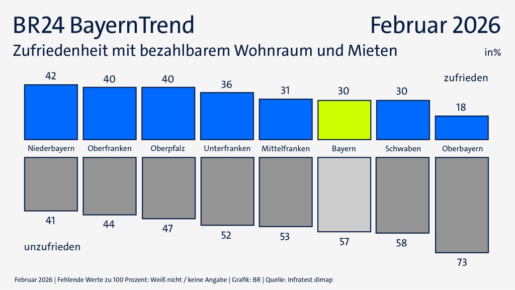 Mit dem öffentlichen Nahverkehr sind die Schwaben mit 37 Prozent hingegen unterdurchschnittlich zufrieden (Bayern: 44 Prozent). Bei der Frage nach bezahlbarem Wohnraum liegen die Schwaben mit 30 Prozent Zufriedenheit zwar im bayerischen Schritt – allerdings sind auch nur die Menschen in Oberbayern weniger zufrieden (18 Prozent).