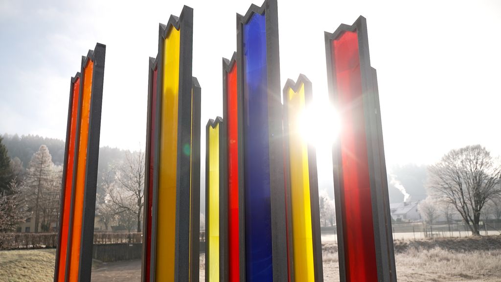 Das Mahnmal - 15 bunte Stelen mit zackigen Kronen erinnern an die 15 Menschen, die jäh aus dem Leben gerissen wurden.