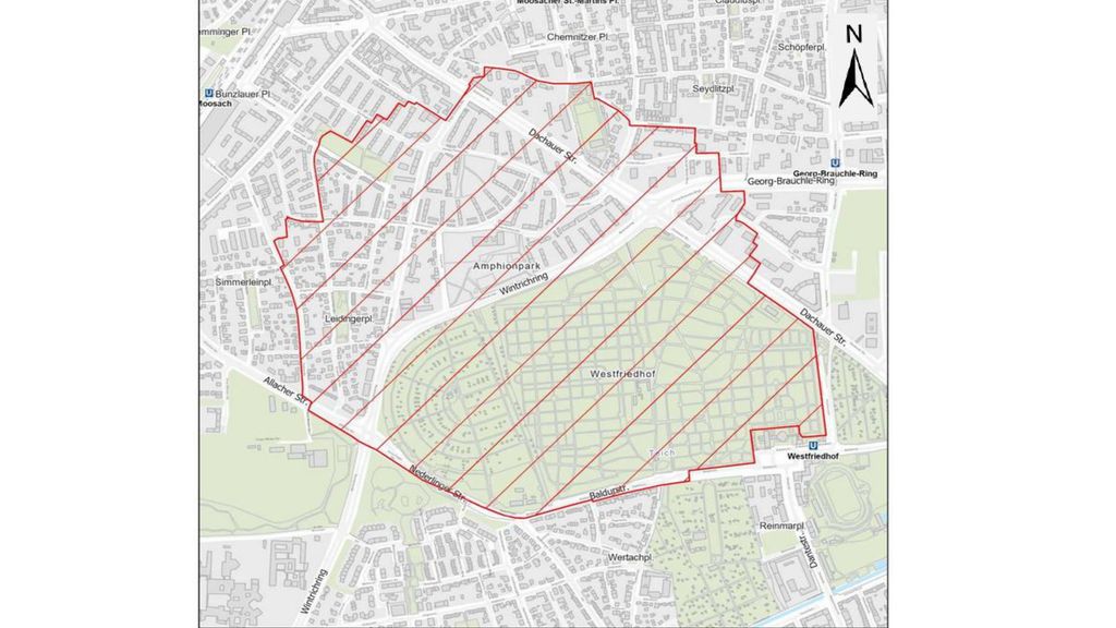 Der Bereich erstreckt sich über den Westfriedhof und die angrenzende Nachbarschaft im Norden des Friedhofs.