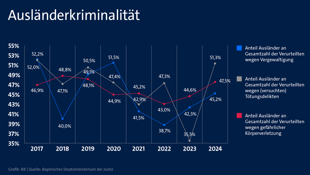 Verurteilungen wegen Gewalttaten nehmen aber auch bei Erwachsenen zu, wobei in Bayern die Zahl der Verurteilten im Jahr 2024 insgesamt gesunken ist. Fast 83 Prozent waren Männer – und fast die Hälfte aller Verurteilten Ausländer. Der Anteil von Straftaten nach dem Asyl-, Aufenthalts- oder Staatsangehörigkeitsgesetz beträgt dabei weniger als zwei Prozent. Die häufigste Straftat bei Ausländern ist Diebstahl. Enorm gestiegen (von 35,5 auf 51,3 Prozent) ist der Anteil der verurteilten Ausländer bei (versuchten) Tötungsdelikten.