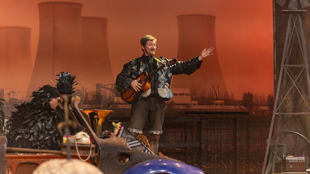 Der Vorhang geht auf. Zu hören sind eine Trommel, Gitarren und Cello. Mehrere Raben flattern auf die Bühne, einige von ihnen kommen aus dem Zuschauerraum. Sie krächzen und streiten sich um eine Brezel, die auf dem sandigen Boden liegt. Ein unheilvoller Gesang wird lauter: "Nimmermehr, nimmermehr, nimmermehr."