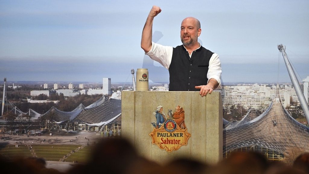 Wie schon im vergangenen Jahr übernimmt Luise Kinseher auch dieses Mal wieder die Aufgabe, die Gäste zu empfangen. "Welche Freude!", ruft sie und lobt die bayerische Tradition der Starkbierprobe: "Wir trinken, wie damals schon die Mönche, unseren Salvator". In der ersten Reihe hätten einst Fürsten und Könige Platz genommen, jetzt seien dort "über die Grenzen von Bayern hinaus bekannte Food-Influencer". Die Spitze gilt Ministerpräsident Markus Söder und seinem Insta-Format "Söder isst".