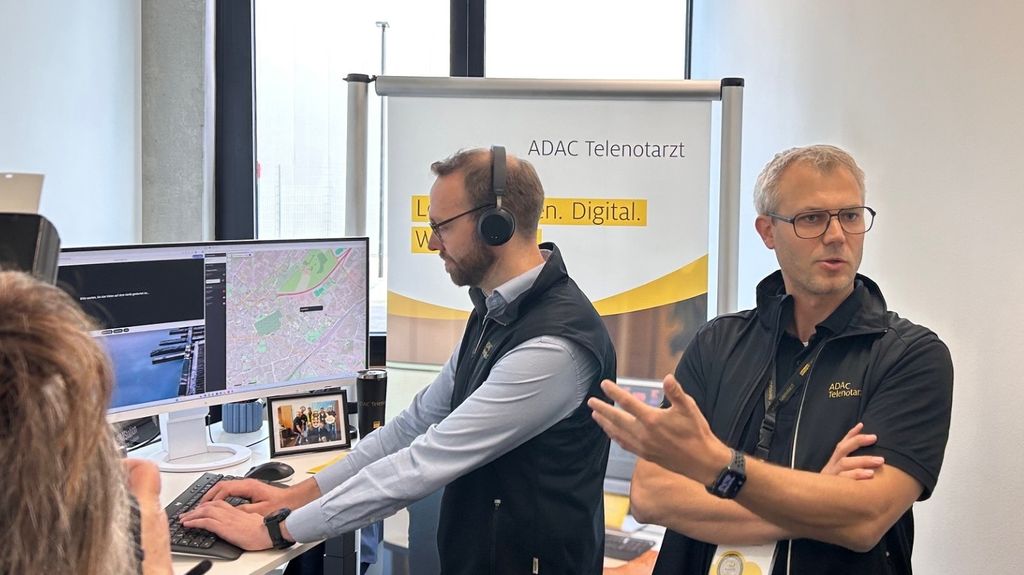 Gleich daneben zeigt der ADAC die Arbeit des Telearztes, der bei Einsätzen Ferndiagnosen stellt und Kontakt zu den Krankenhäusern aufnimmt. Er wurde in Oberpfaffenhofen in den neuen Campus integriert.