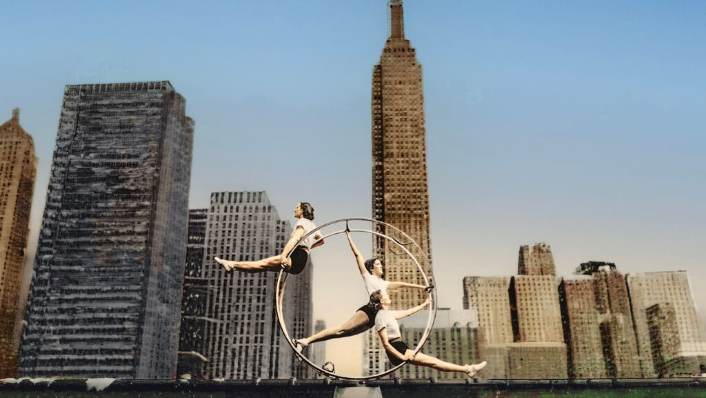 (Archivbild) Drei Turnerinnen in einem Rhön-Rad. Im Hintergrund: die Wolkenkratzer von New York.