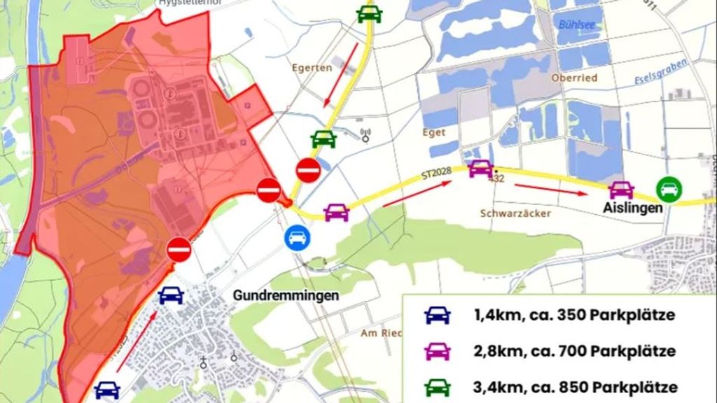 Genaue Zufahrtsempfehlungen aus dem Norden, Süden oder von Gundremmingen gibt das Landratsamt online [externer Link]. Wer die Möglichkeit hat, solle mit dem Fahrrad anreisen, betont die Gemeinde Gundremmingen.