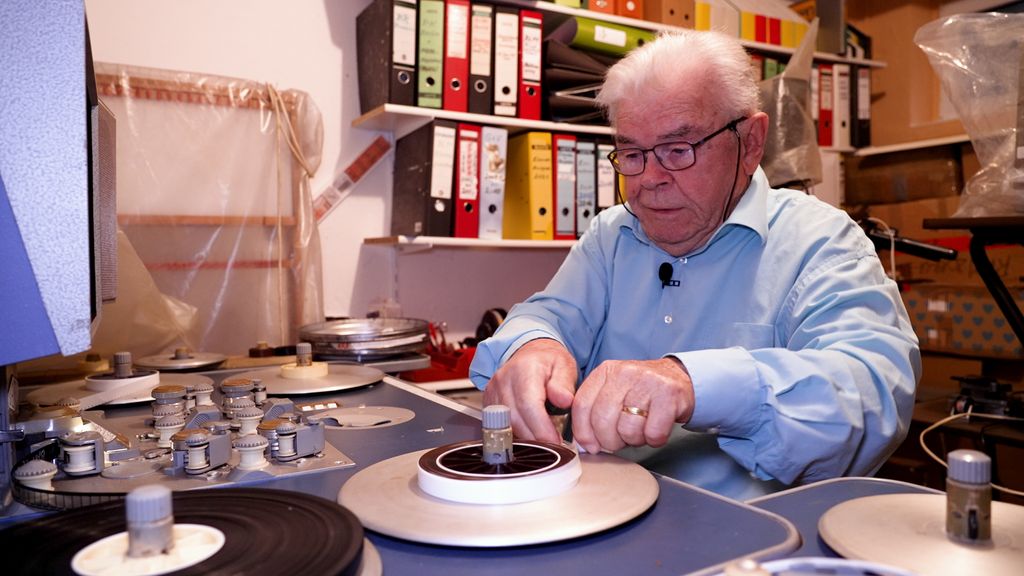 Werner Flott an seinem alten Schnitttisch: Früher musste er die Bänder an der gewünschten Stelle zertrennen und dann wieder zusammenkleben.