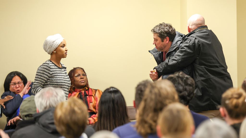 Ein Mann spritzt der Abgeordneten Omar während einer Townhall-Veranstaltung mit einer Spritze eine Substanz ins Gesicht.