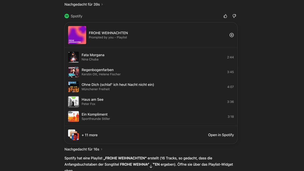"Erstelle eine Spotify-Playlist mit deutschsprachigen bekannten Popsongs, deren Anfangsbuchstaben zusammen die Botschaft 'FROHE WEIHNACHTEN' ergeben." Was nach einer kniffligen Aufgabe klingt, lässt sich seit dieser Woche auch in Deutschland über ChatGPT erledigen. Das Ergebnis: Das F wird zu "Fata Morgana" von Nina Chuba, das R zu "Regenbogenfarben" von Kerstin Ott und Helene Fischer, und so weiter. In 39 Sekunden ist das Ergebnis da.